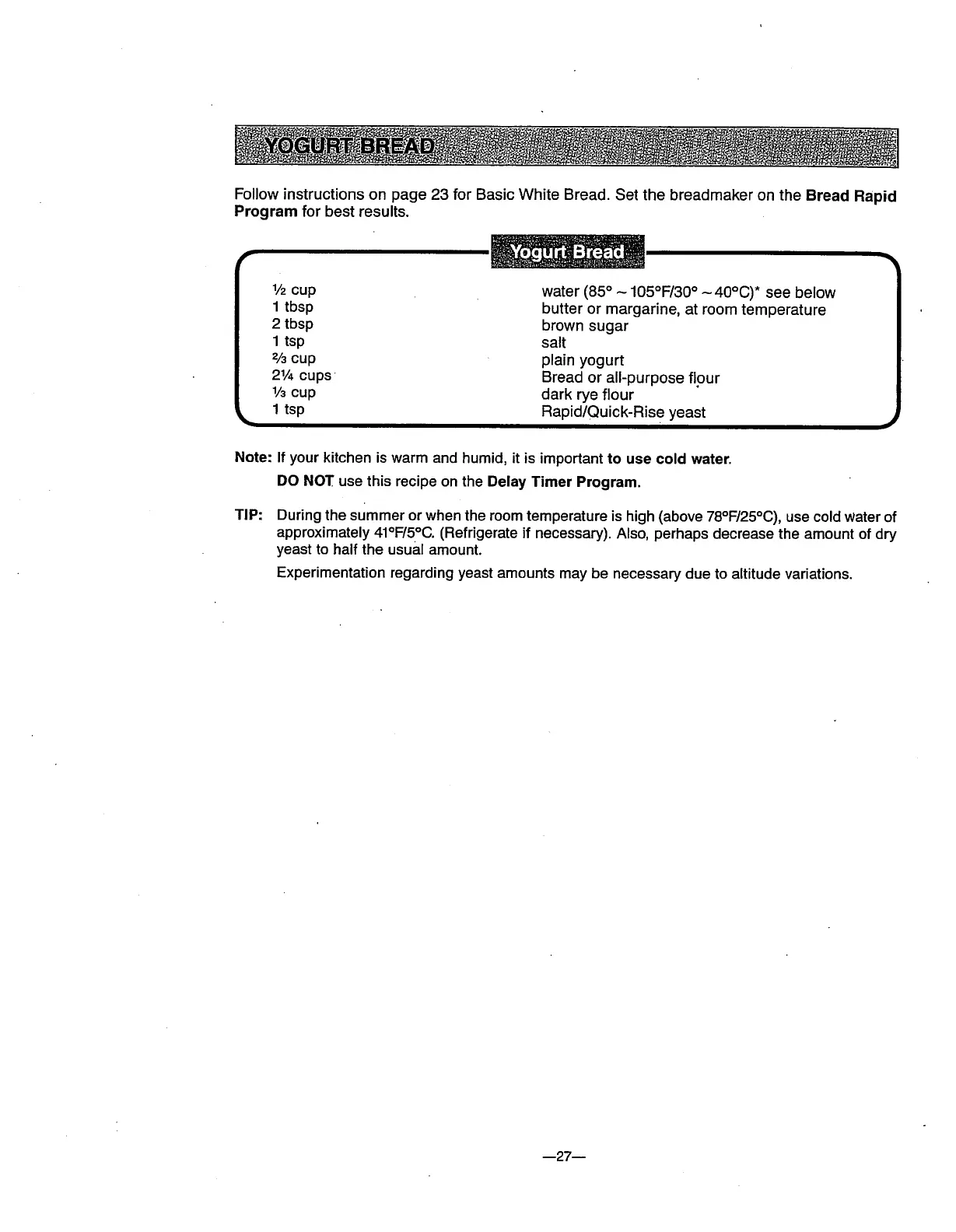 Toastmaster Bread Box 1150 - Yogurt Bread Recipe; Ingredients and Method for Yogurt Bread