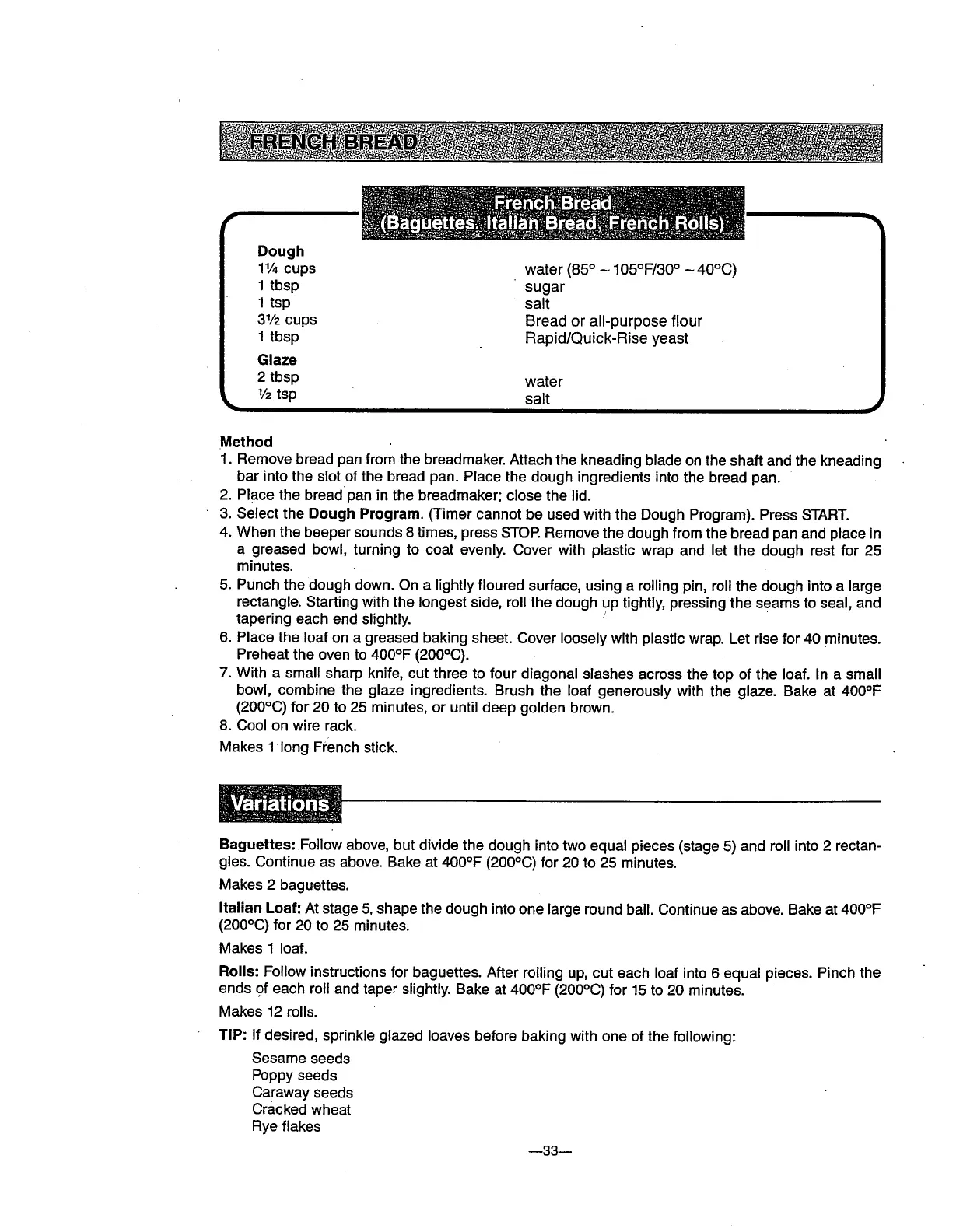 Toastmaster Bread Box 1150 - French Bread Recipe; French Bread Dough, Glaze, and Variations