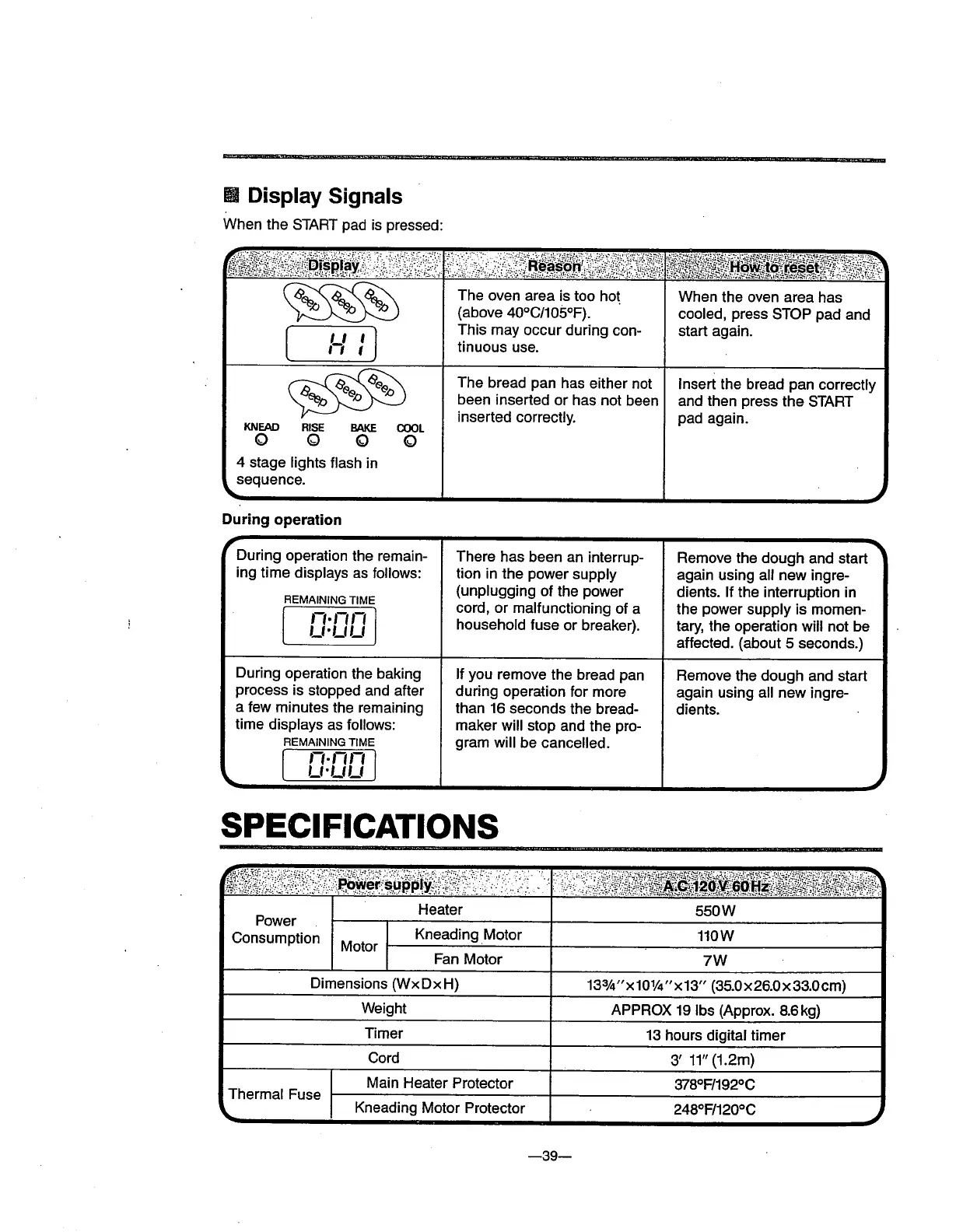 Toastmaster Bread Box 1150 - Display Signals and Specifications; Understanding Signals and Machine Specs