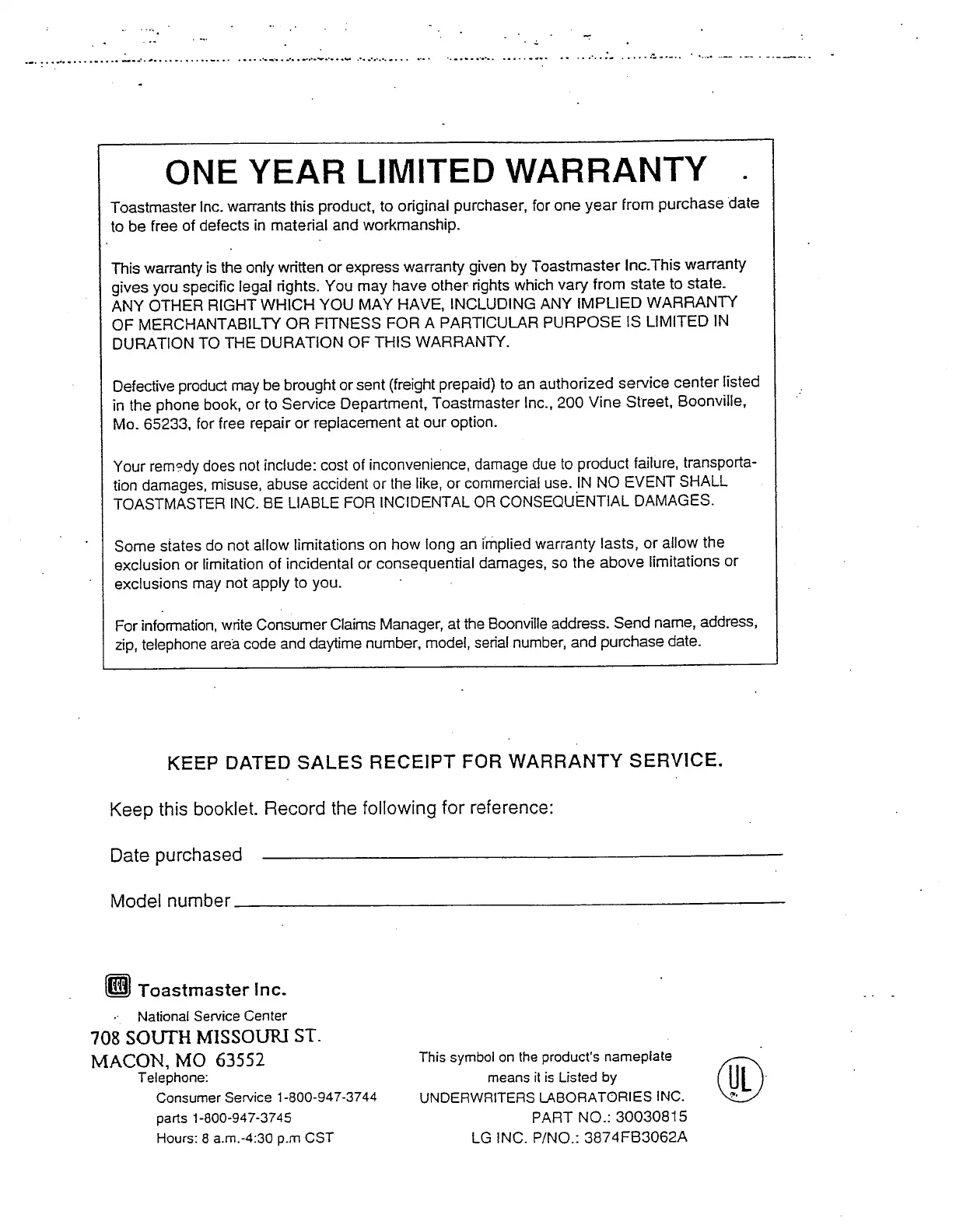 Toastmaster Bread Box 1150 - Warranty Information; One Year Limited Warranty Details