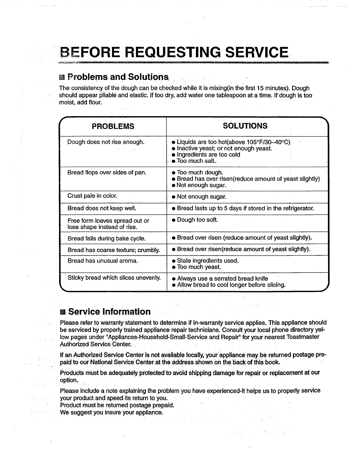 Dough does not rise enough. • Liquids are too hot(above 105°F/30-40°C)