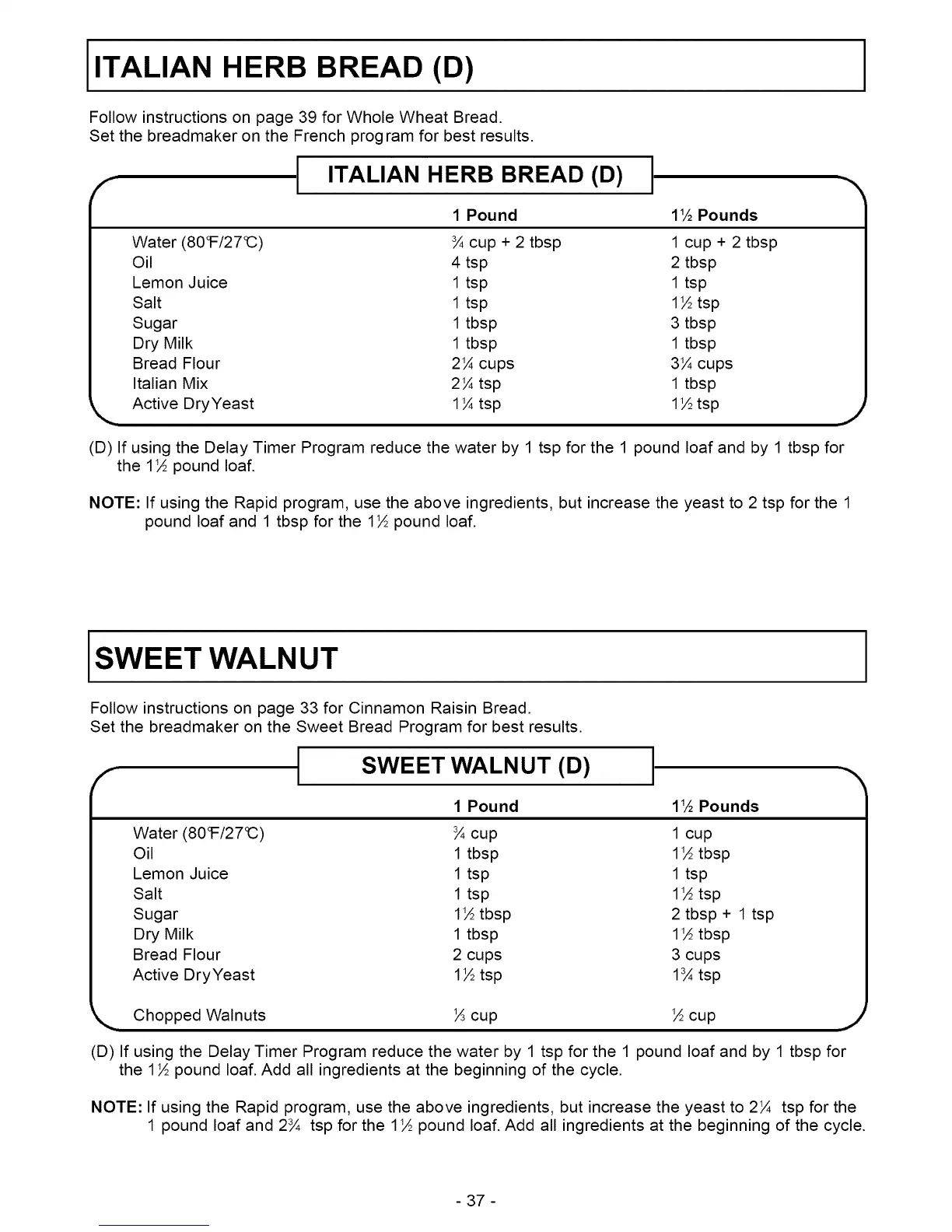 (D) If using the Delay Timer Program reduce the water by 1 tsp for the 1 pound loaf and by 1 tbsp for