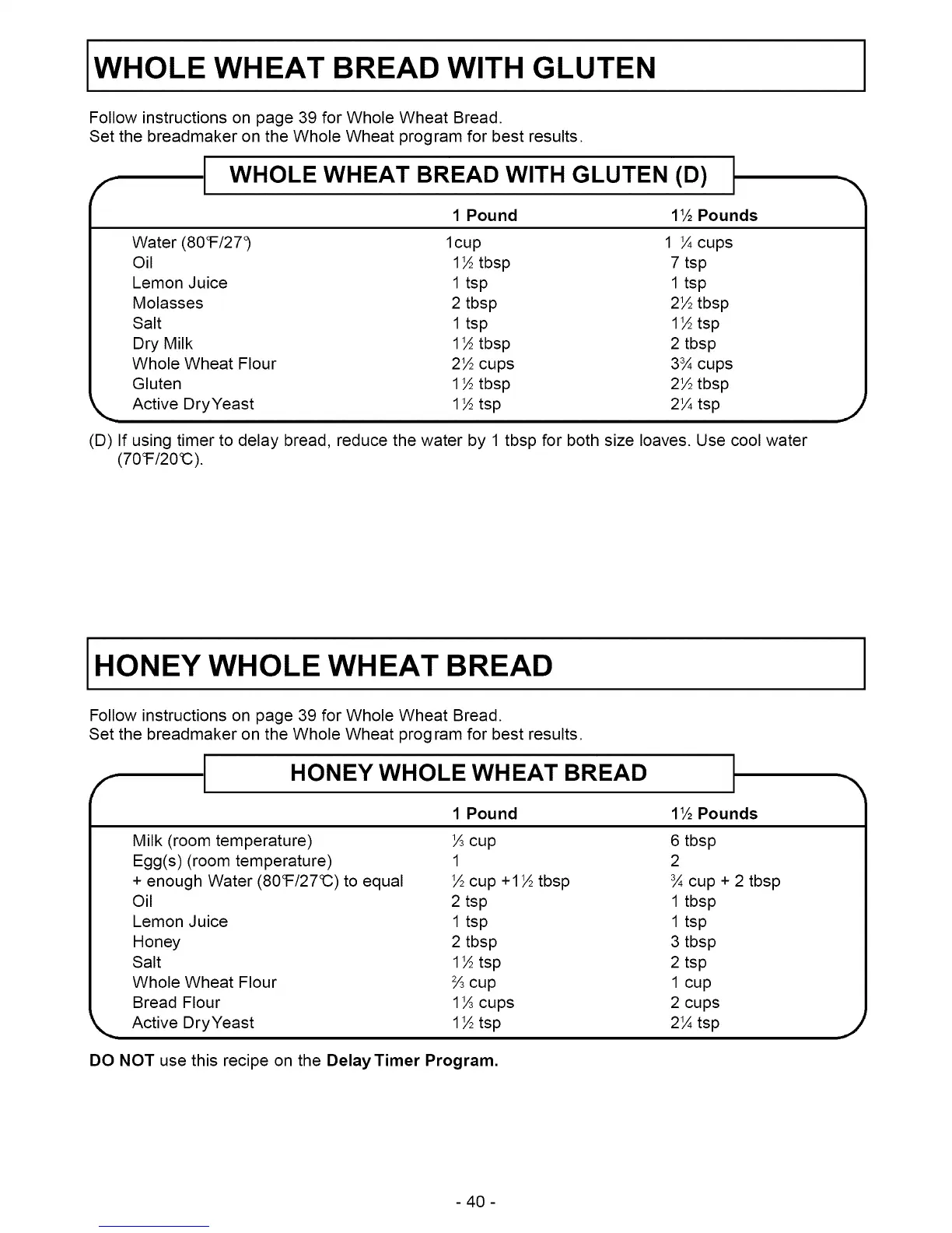 (D) If using timer to delay bread, reduce the water by 1 tbsp for both size loaves. Use cool water