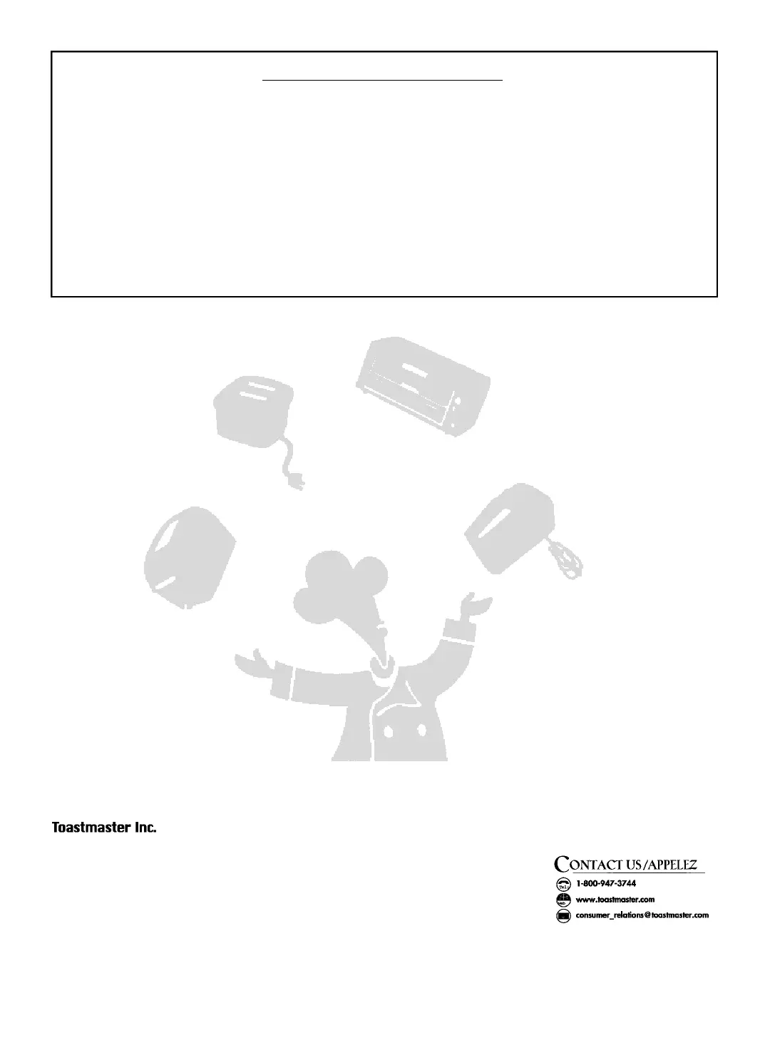 Department, Toastmaster Inc., 708 South Missouri St., Macon, MO 63552, for free repair or replacement at our option.