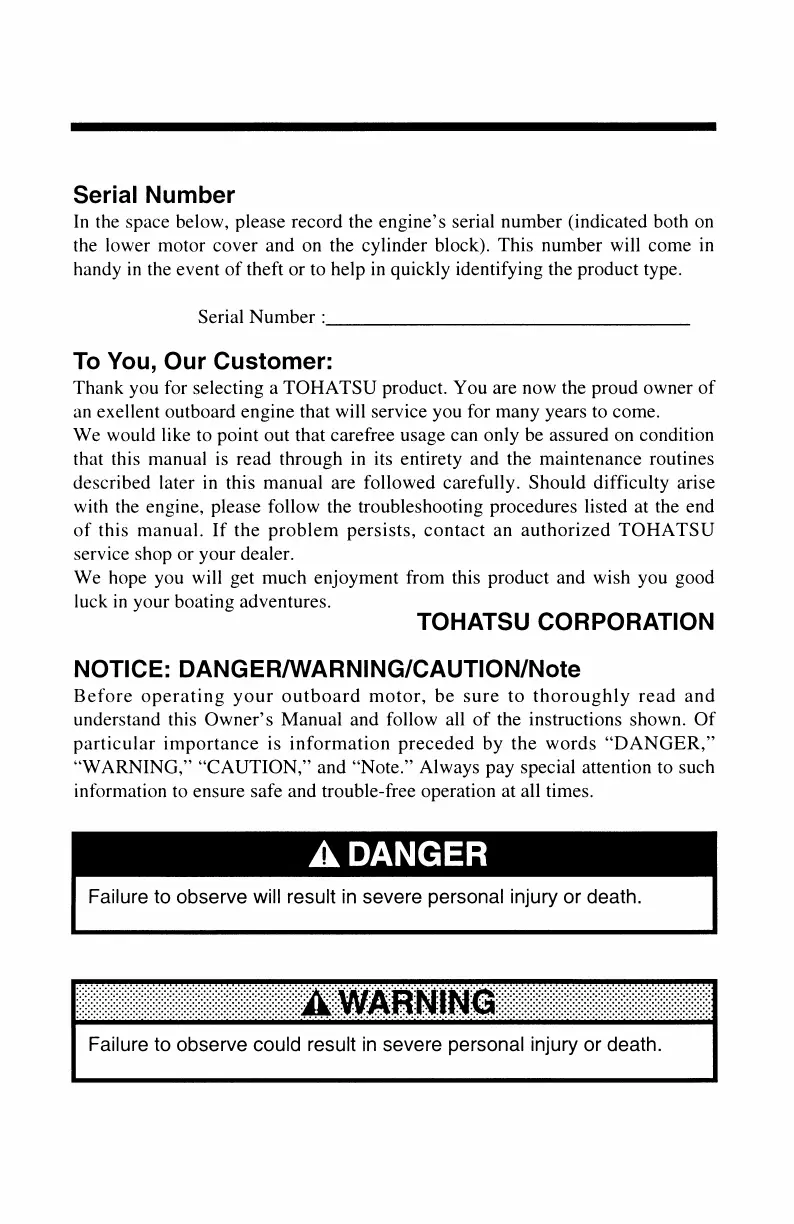 TOHATSU 8 - Serial Number Recording; Safety Notices and Definitions; Understanding Safety Labels