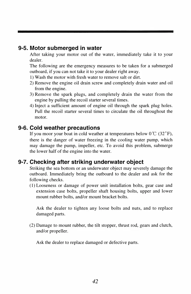 TOHATSU 8 - Motor Submerged in Water Emergency; Cold Weather Operation Precautions; Checking After Striking Underwater Object