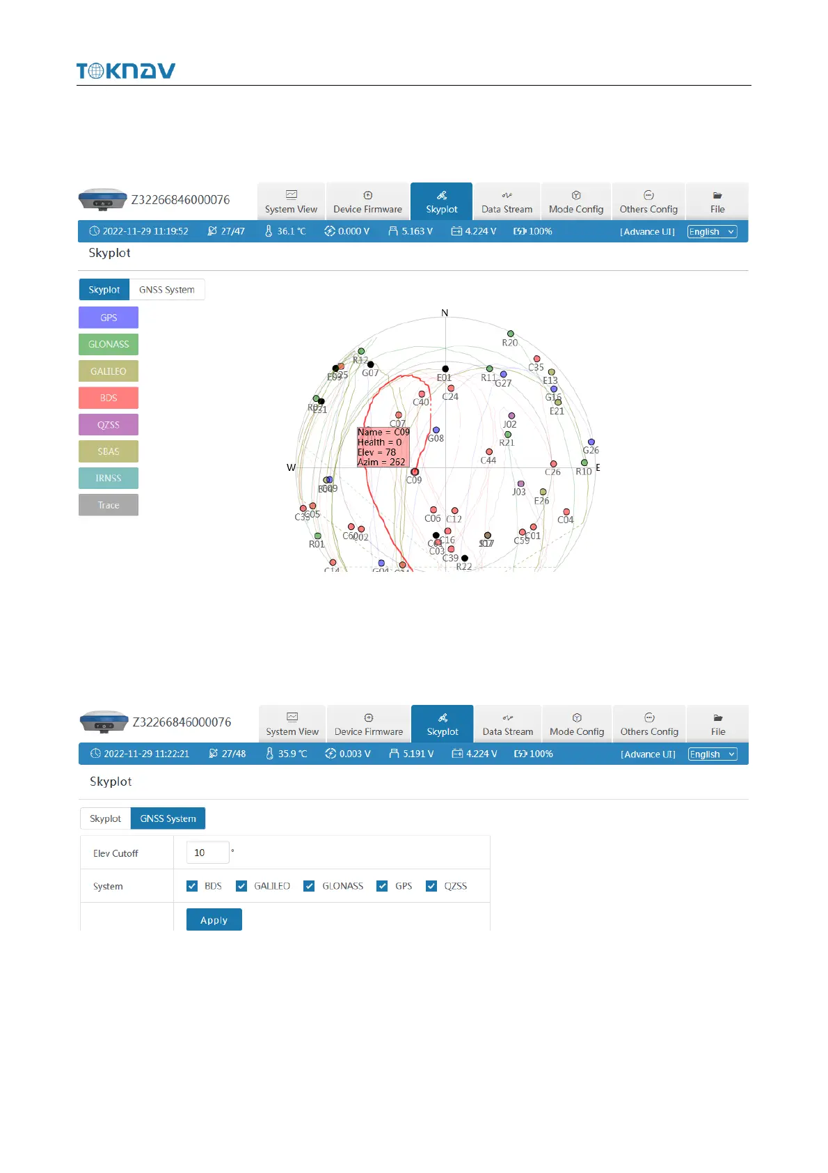 ② GNSS System : Elev Cutoff, System, Table, Chart.
