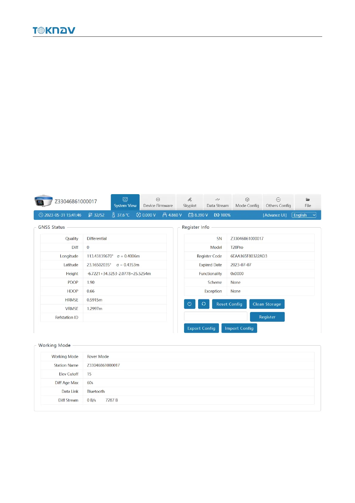 ① Device Info: SN, Hardware, GNSS Type, GNSS Hardware;