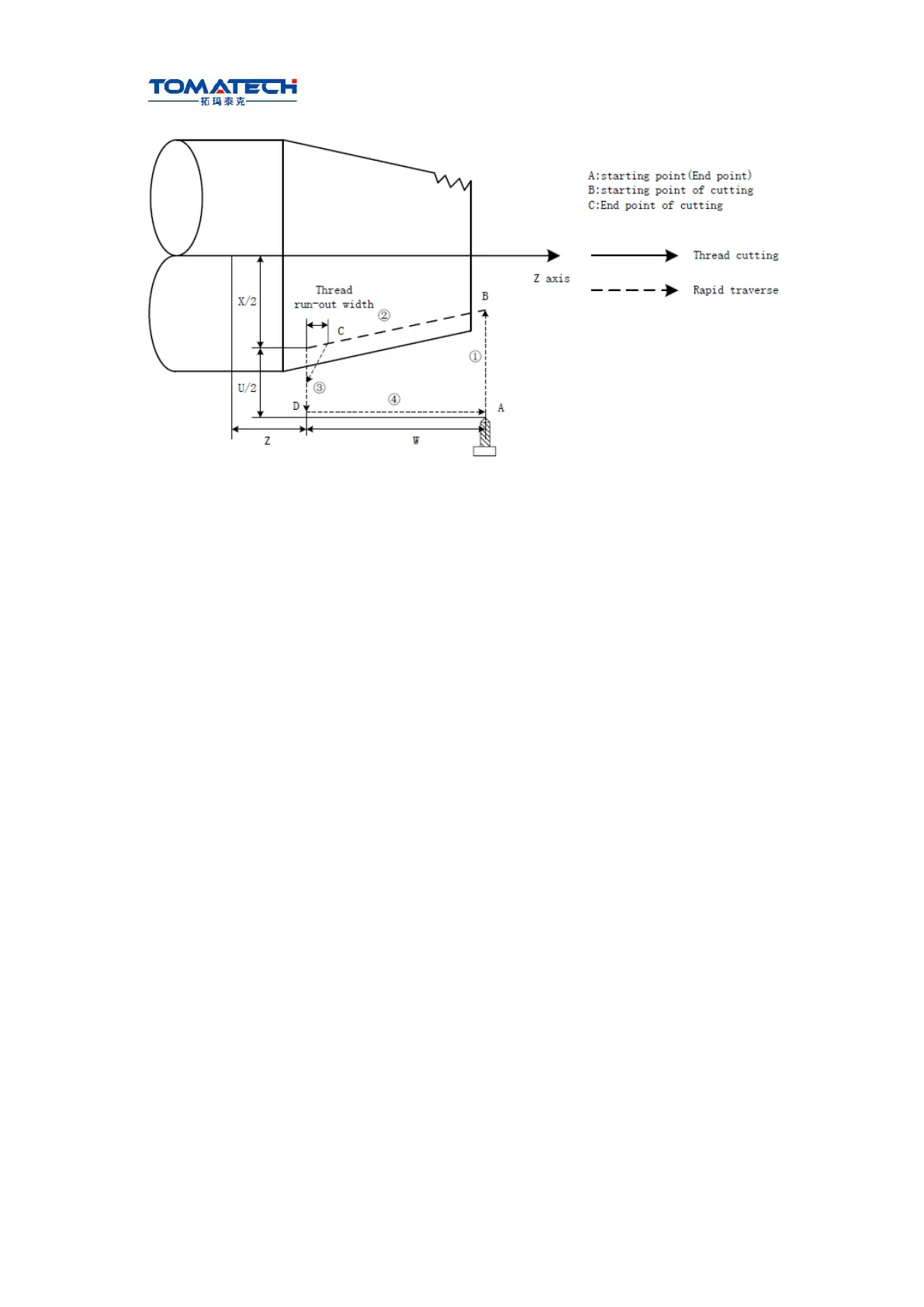 ② Thread interpolates (linear interpolation) from the cutting starting point to cutting end