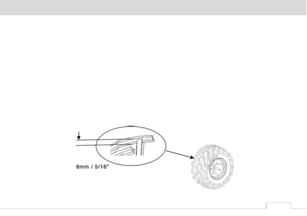 Always replace tires when the tread depth is worn to 5/16 in. (8 mm) or less on both front and rear wheels.