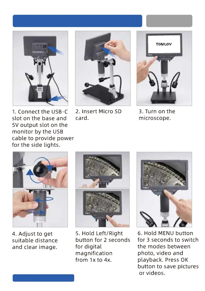 TOMLOV DM201 SE - Quick Start; Connect USB-C Cable; Insert Micro SD Card; Power On and Adjust Focus