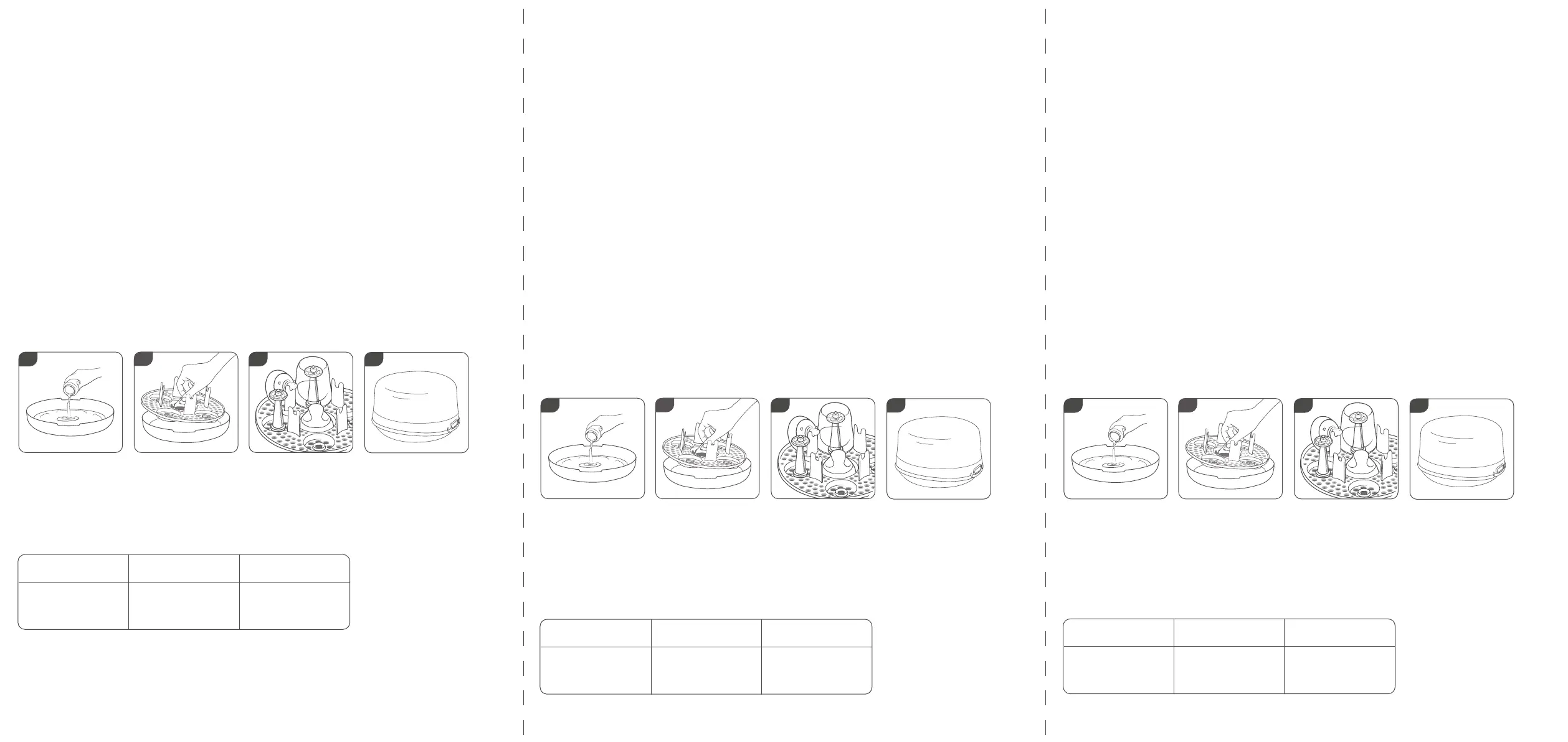 6. Placez le stérilisateur dans le micro-ondes et démarrez le à pleine puissance conformément au tableau ci-dessous.
