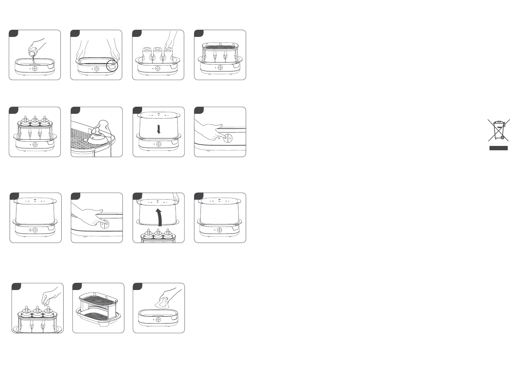 Innan sterilisering, diska alla flaskor och tillbehör i varm tvållösning eller i diskmaskin (endast i övre korgen) för att avlägsna mjölkrester. Ta isär alla delar för