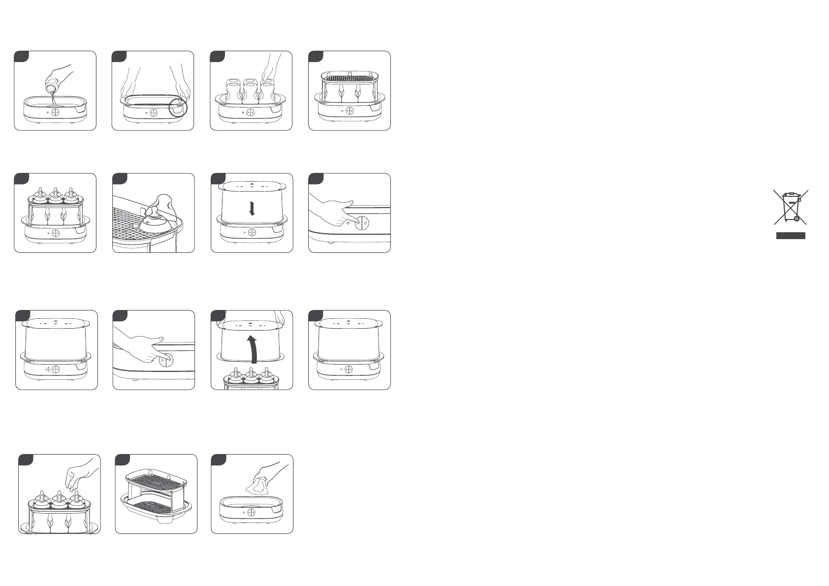 Before sterilisation, wash and rinse thoroughly all bottles and feeding accessories in warm soapy water or in a dishwasher (top rack only) to remove