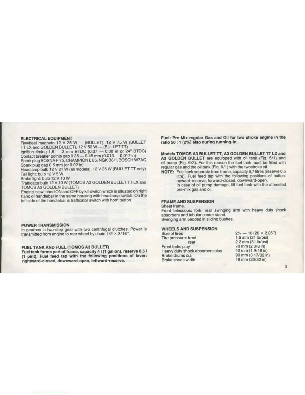 Tomos A3 E BULLET - Electrical Equipment; Power Transmission; Fuel Tank and Fuel; Frame and Suspension