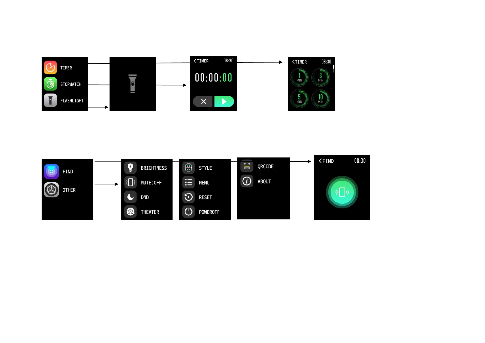 ●Other Functions: Set the display brightness of the watch, Vibration Switch, NO Disturb Mode, Theater Mode, and the Dial Plate Switch. Switch the watch function