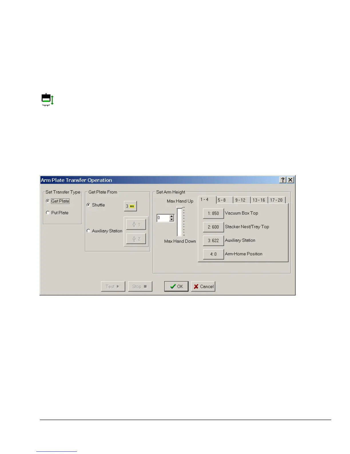 The arm plate transfer operation is used to get plates from and put plates to a stacker