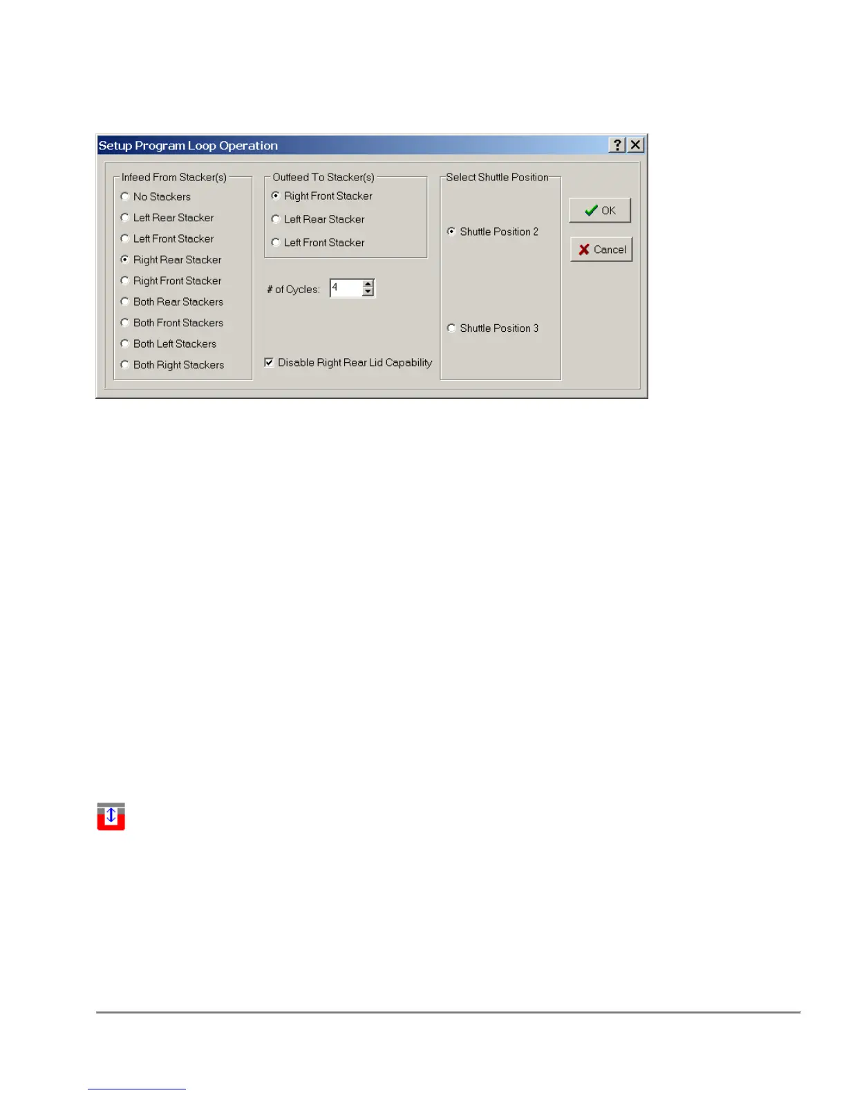 Selects stacker or stackers to infeed plates to the shuttle. For a simple Program loop,
