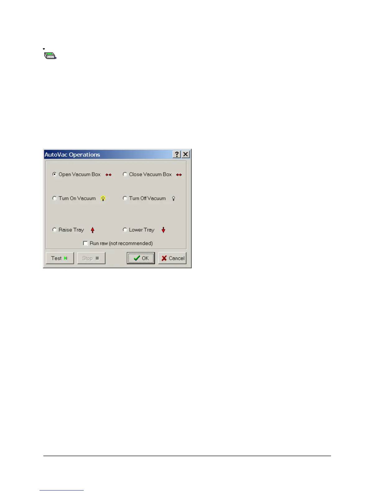 Raise Tray performs vacuum off and then raises the tray. If Run Raw is checked then