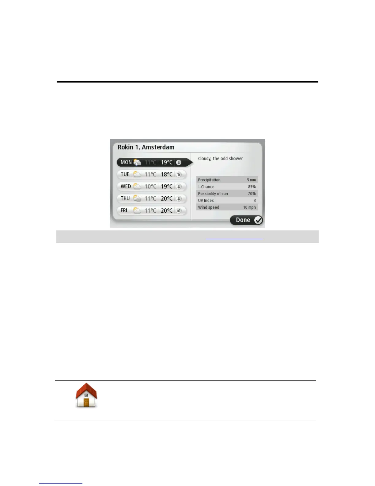 The TomTom Weather service provides detailed weather reports and 5-day weather forecasts for