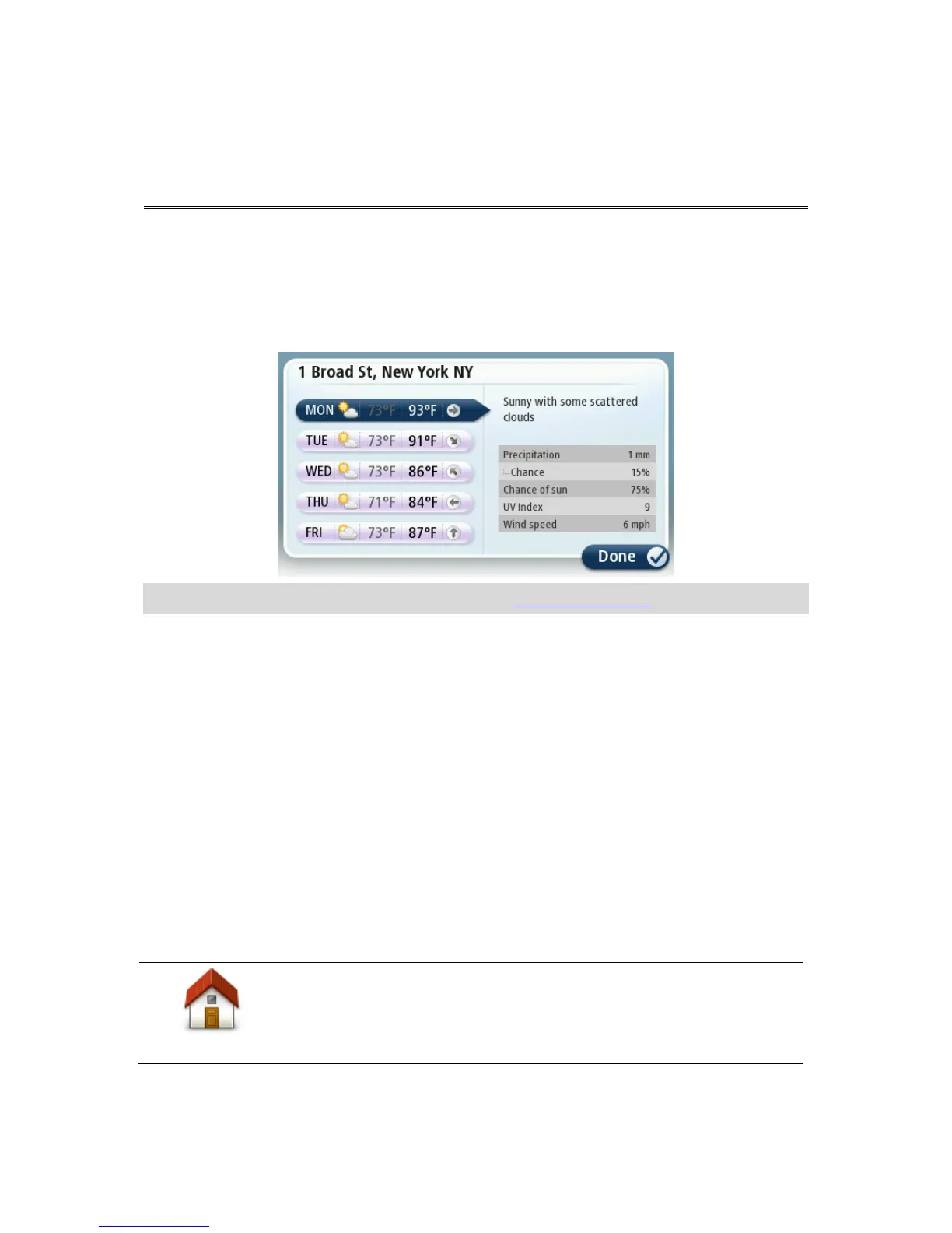 The TomTom Weather service provides detailed weather reports and 5-day weather forecasts for