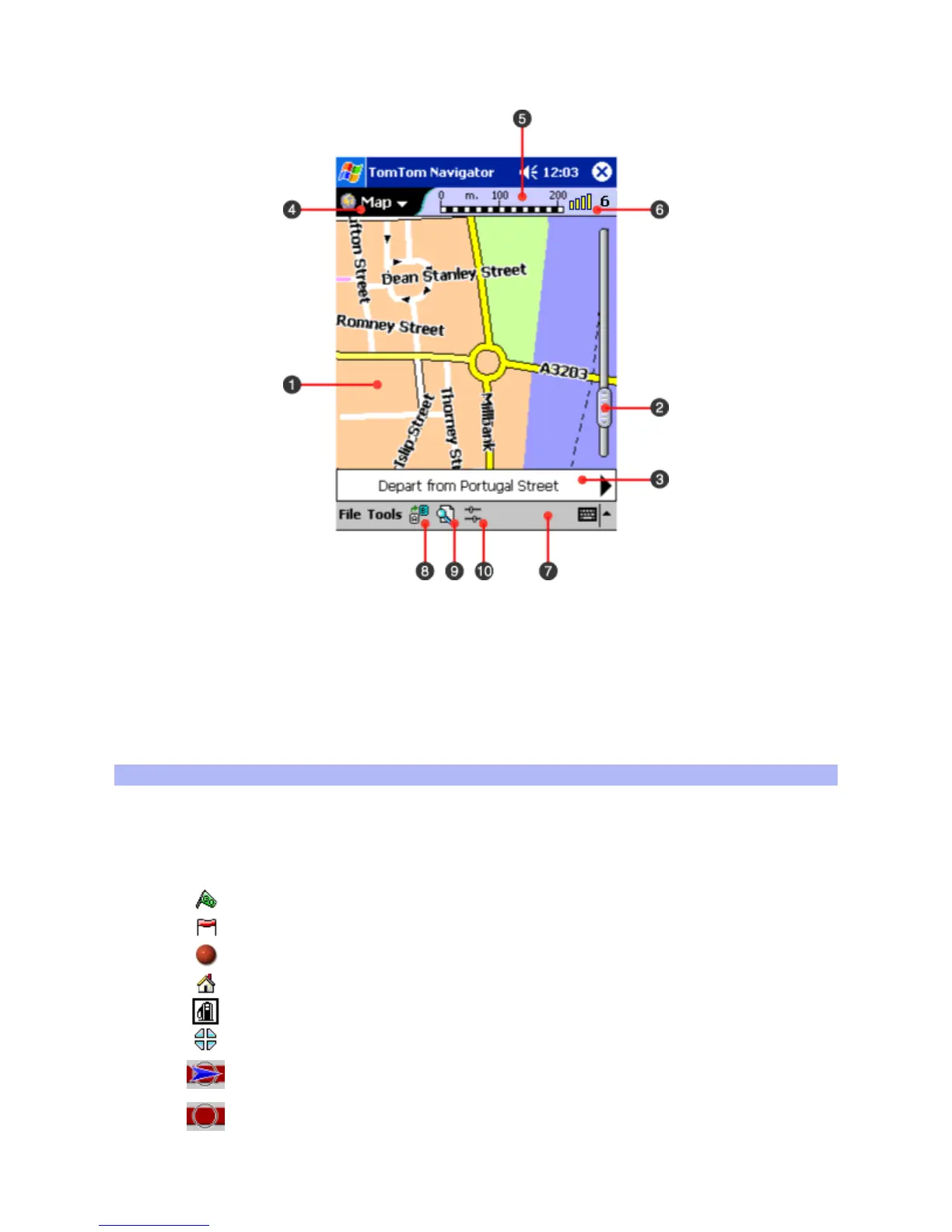 (6) GPS signal indicator, (7) Menu bar,