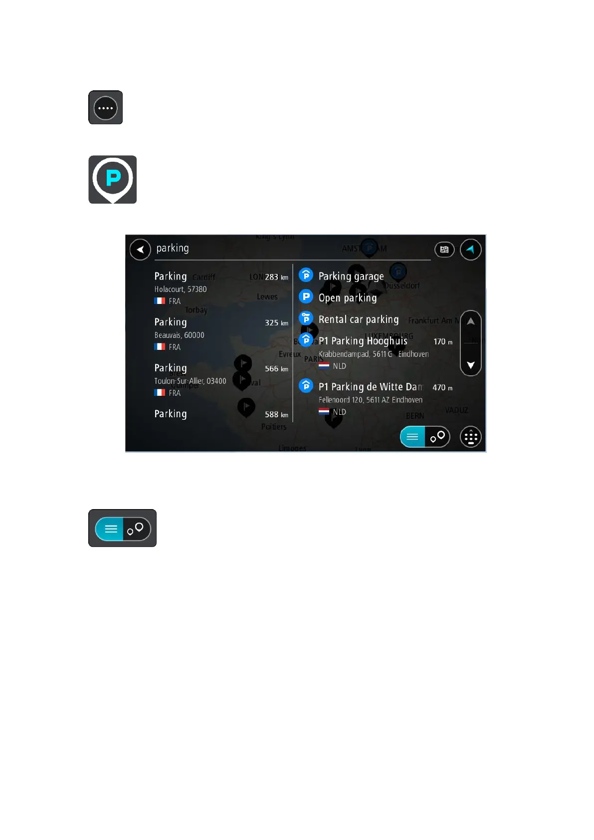 You can change the screen to show a list of parking lots by pressing this button: