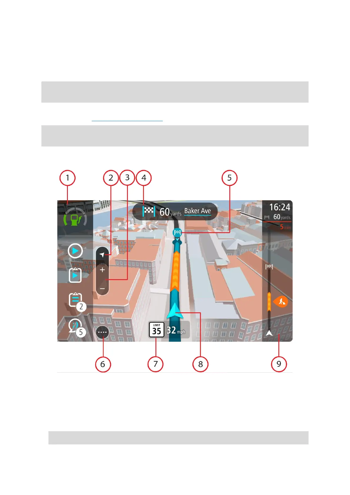 The guidance view is used to guide you along the route to your destination. The guidance view is