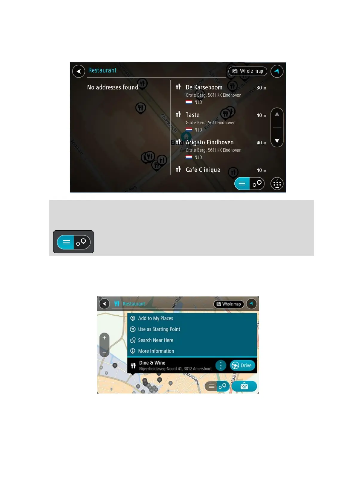 Tip: You can switch between seeing the results on the map or in a list by selecting the