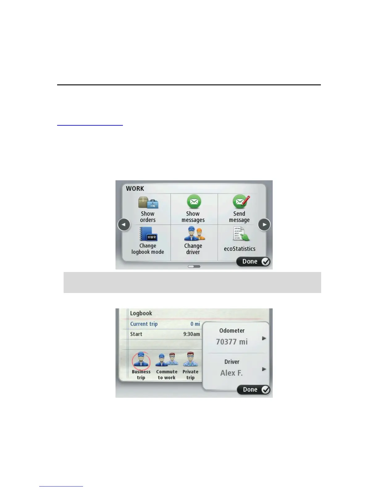 You can generate a driver’s logbook with your TomTom PRO. To use this functionality you need to