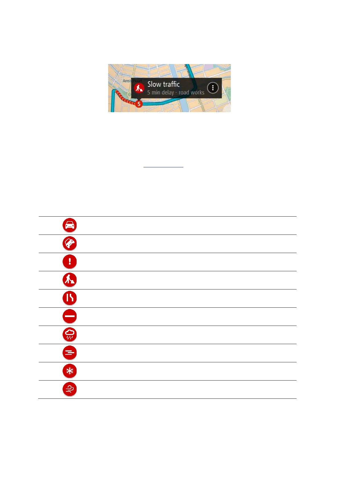The following traffic incident symbols are used in the map view and in the route bar to show the cause