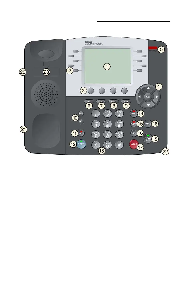 1) Display – shows the multifunction key labels, call states, caller ID,