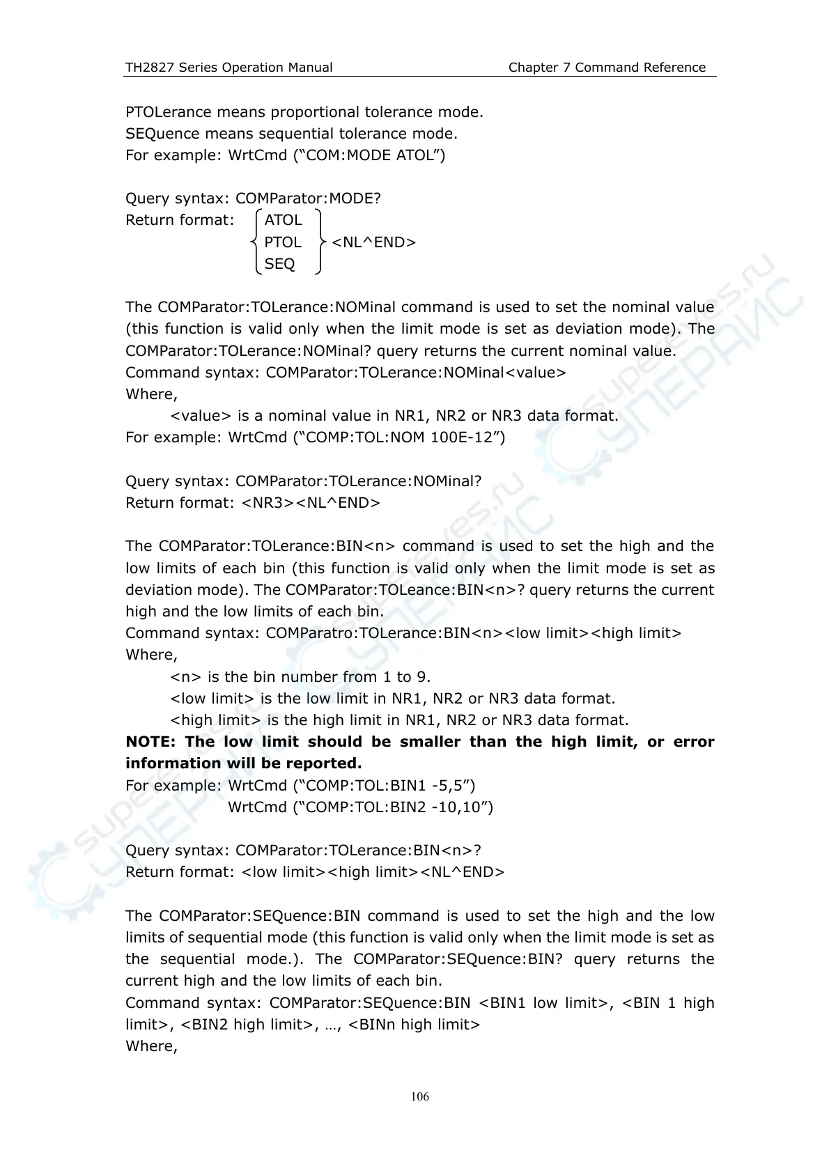 Command syntax: COMParatro:TOLerance:BIN<n><low limit><high limit>