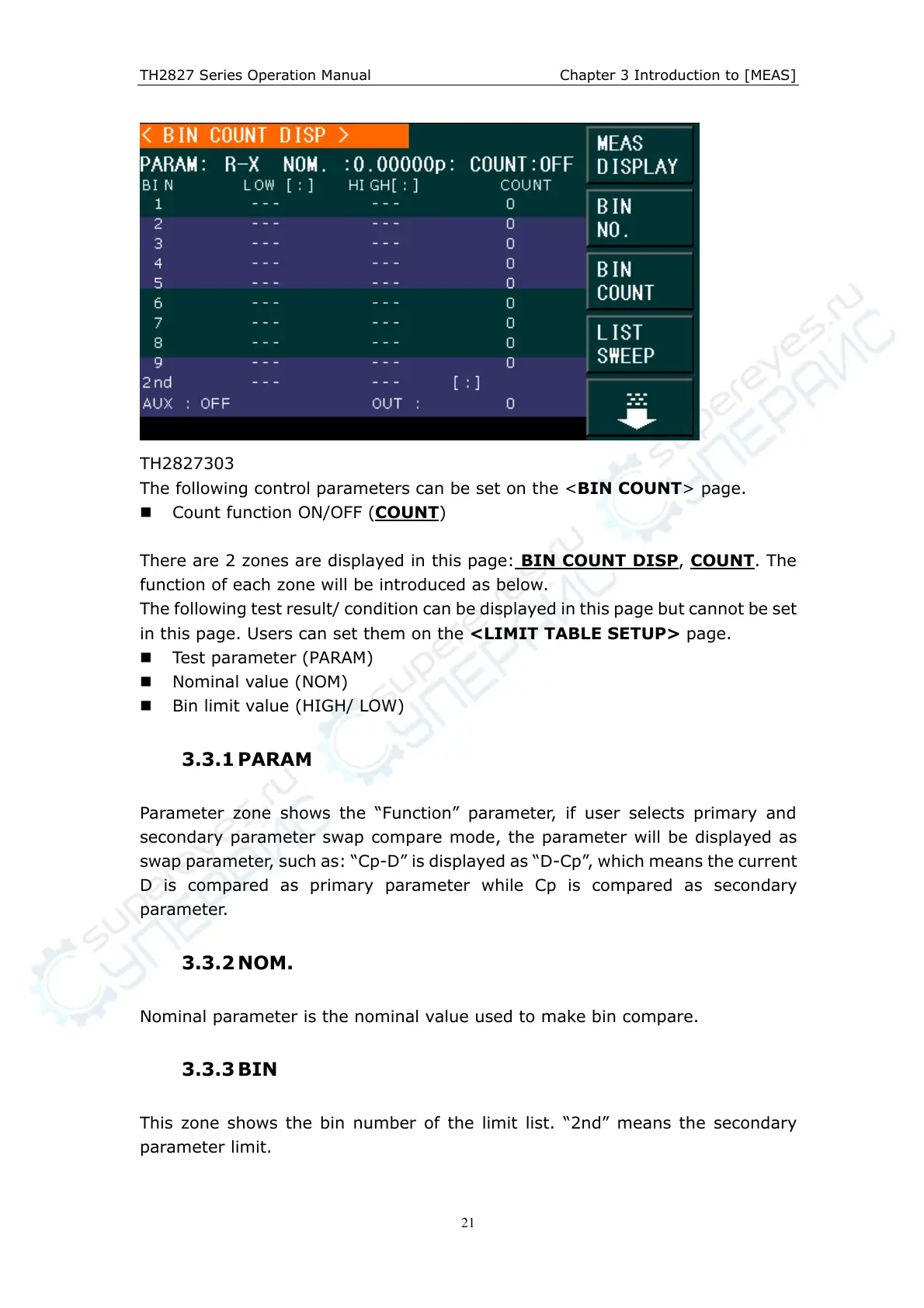 The following control parameters can be set on the <BIN COUNT> page.