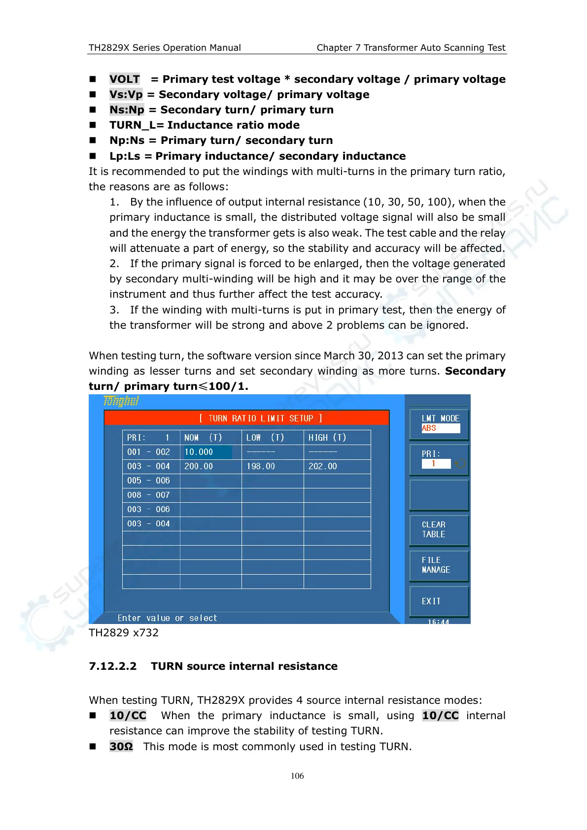 When testing TURN, TH2829X provides 4 source internal resistance modes: