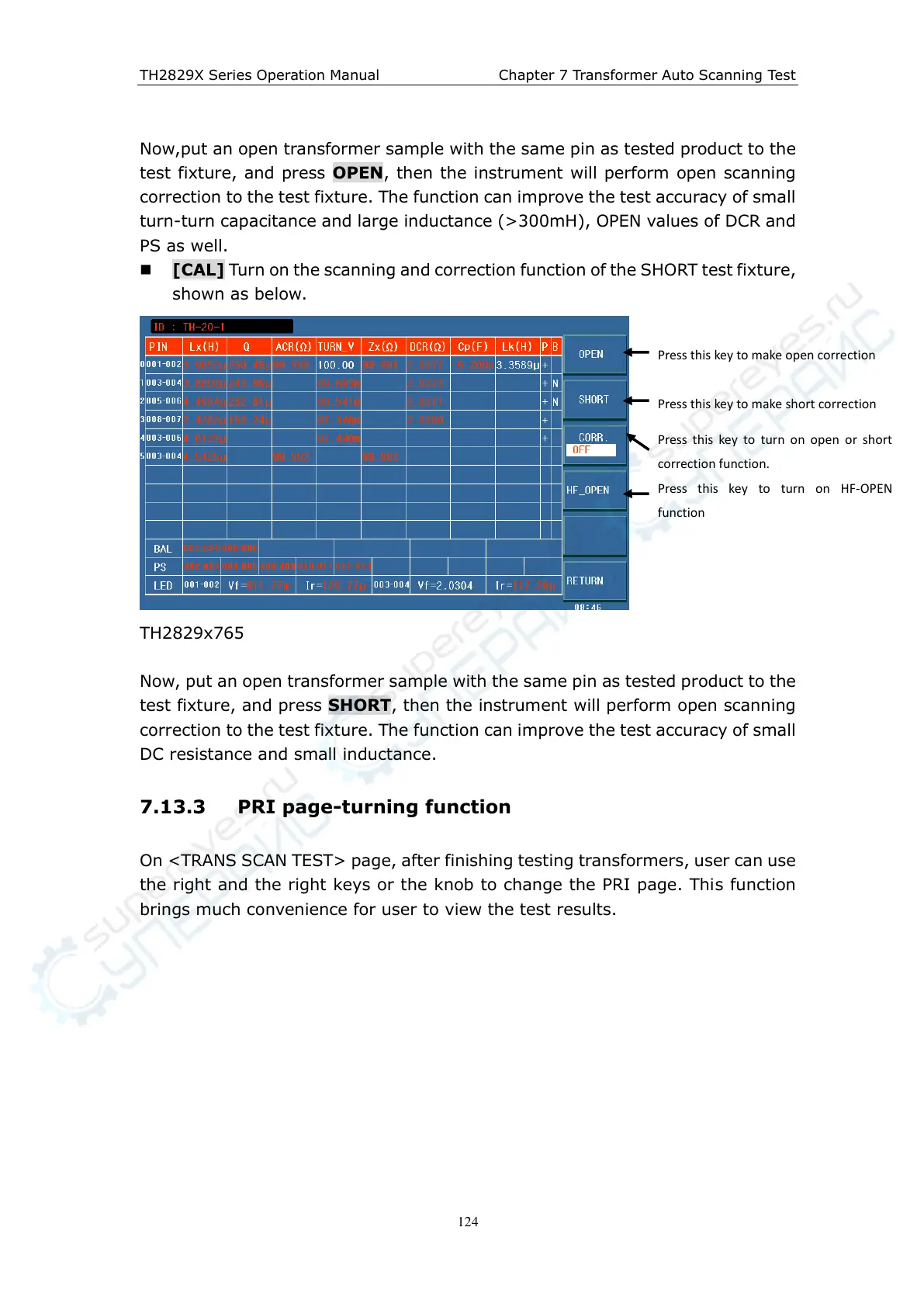 test fixture, and press SHORT, then the instrument will perform open scanning