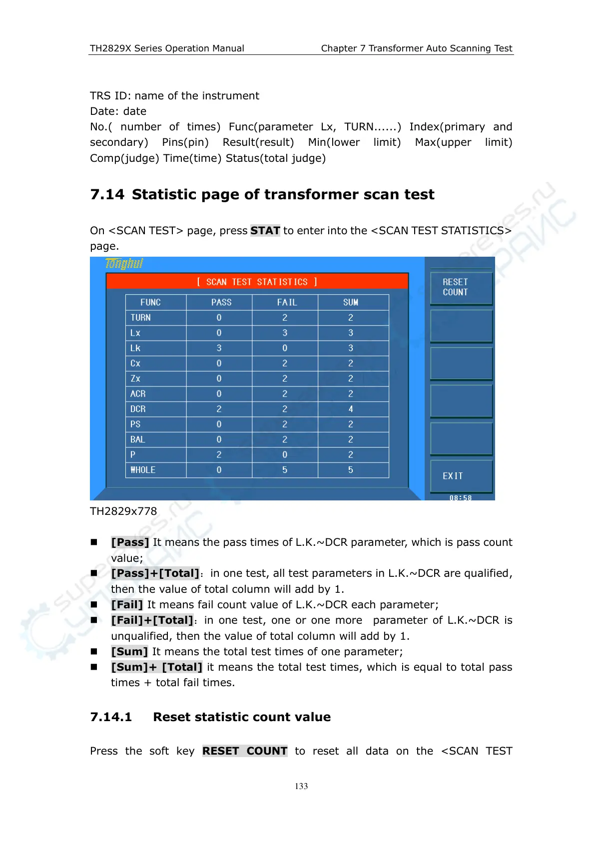 Press the soft key RESET COUNT to reset all data on the <SCAN TEST