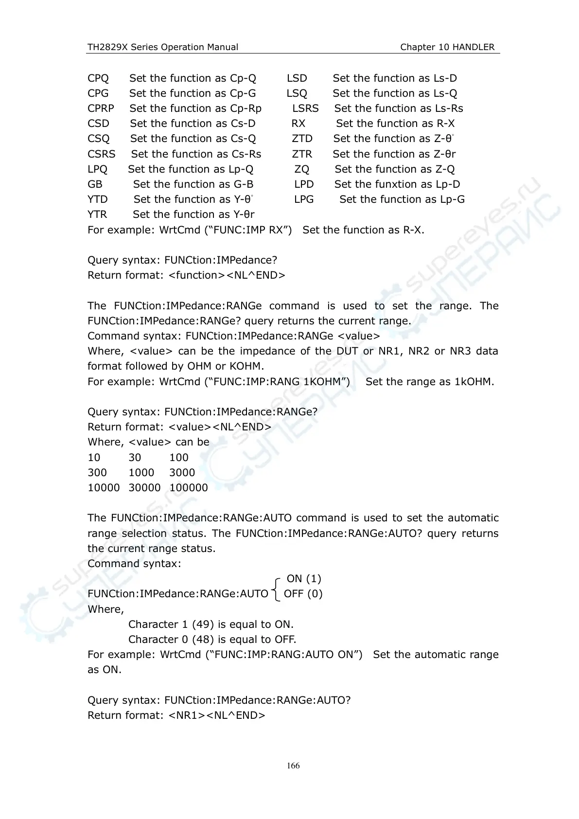 For example: WrtCmd (“FUNC:IMP RX”) Set the function as R-X.