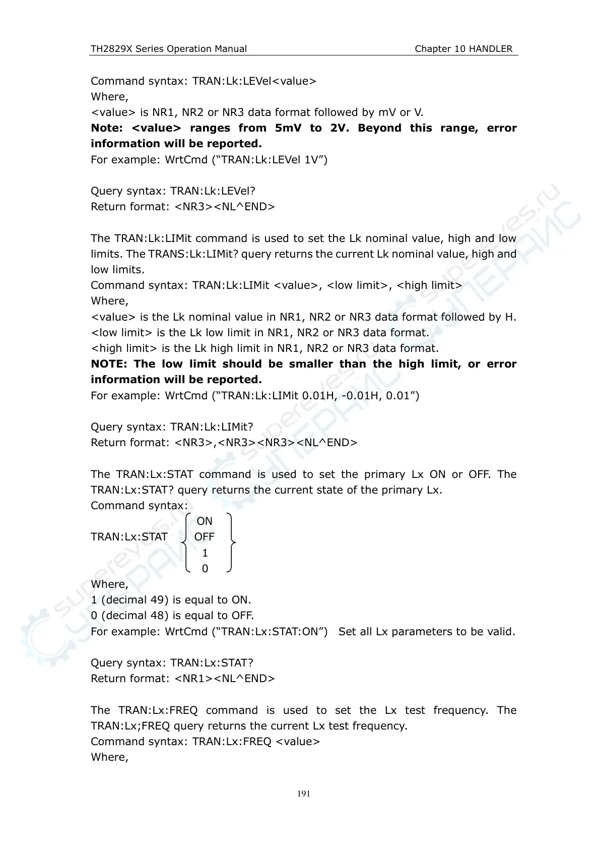 For example: WrtCmd (“TRAN:Lk:LIMit 0.01H, -0.01H, 0.01”)
