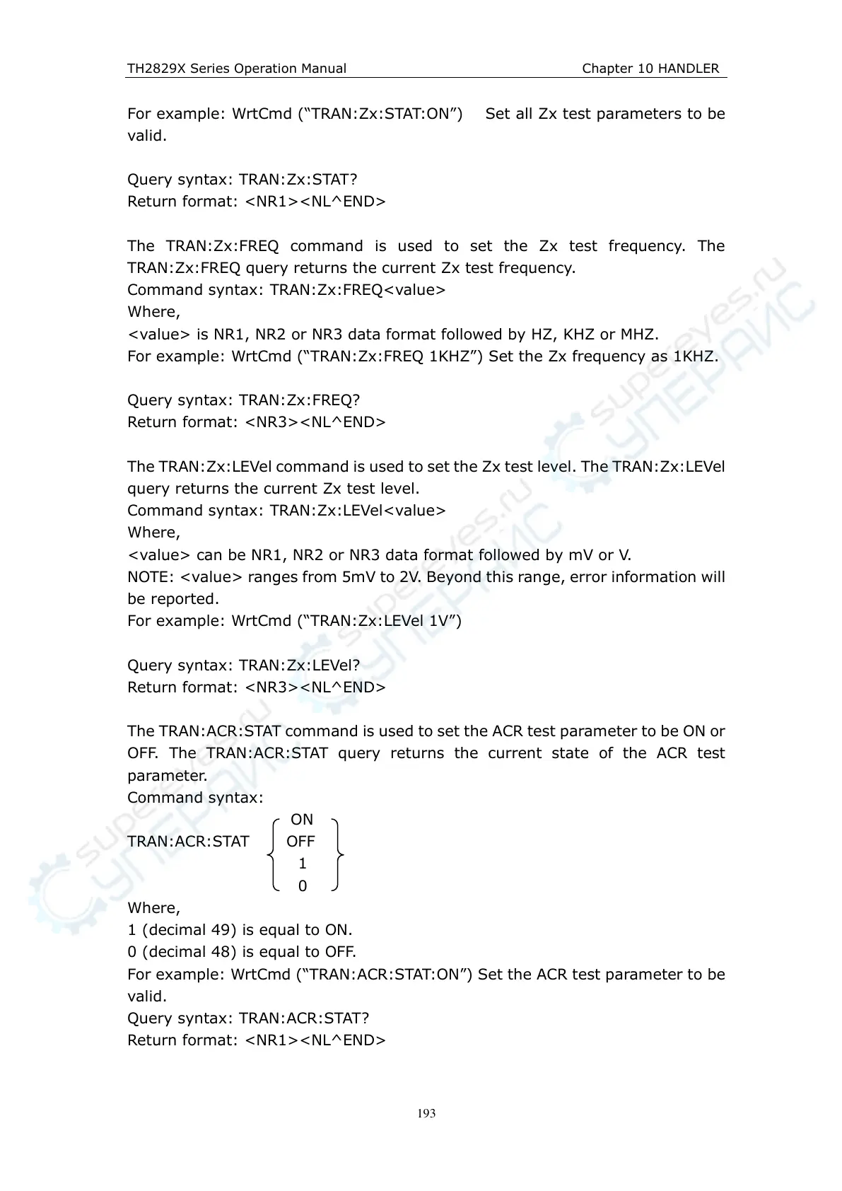 For example: WrtCmd (“TRAN:ACR:STAT:ON”) Set the ACR test parameter to be