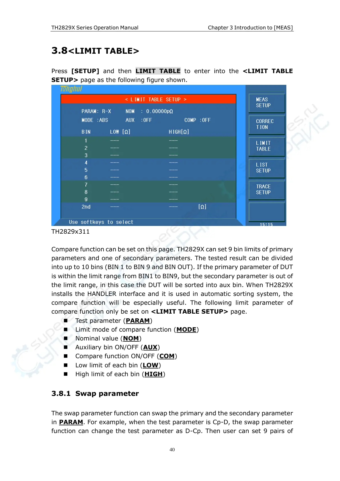 Compare function can be set on this page. TH2829X can set 9 bin limits of primary