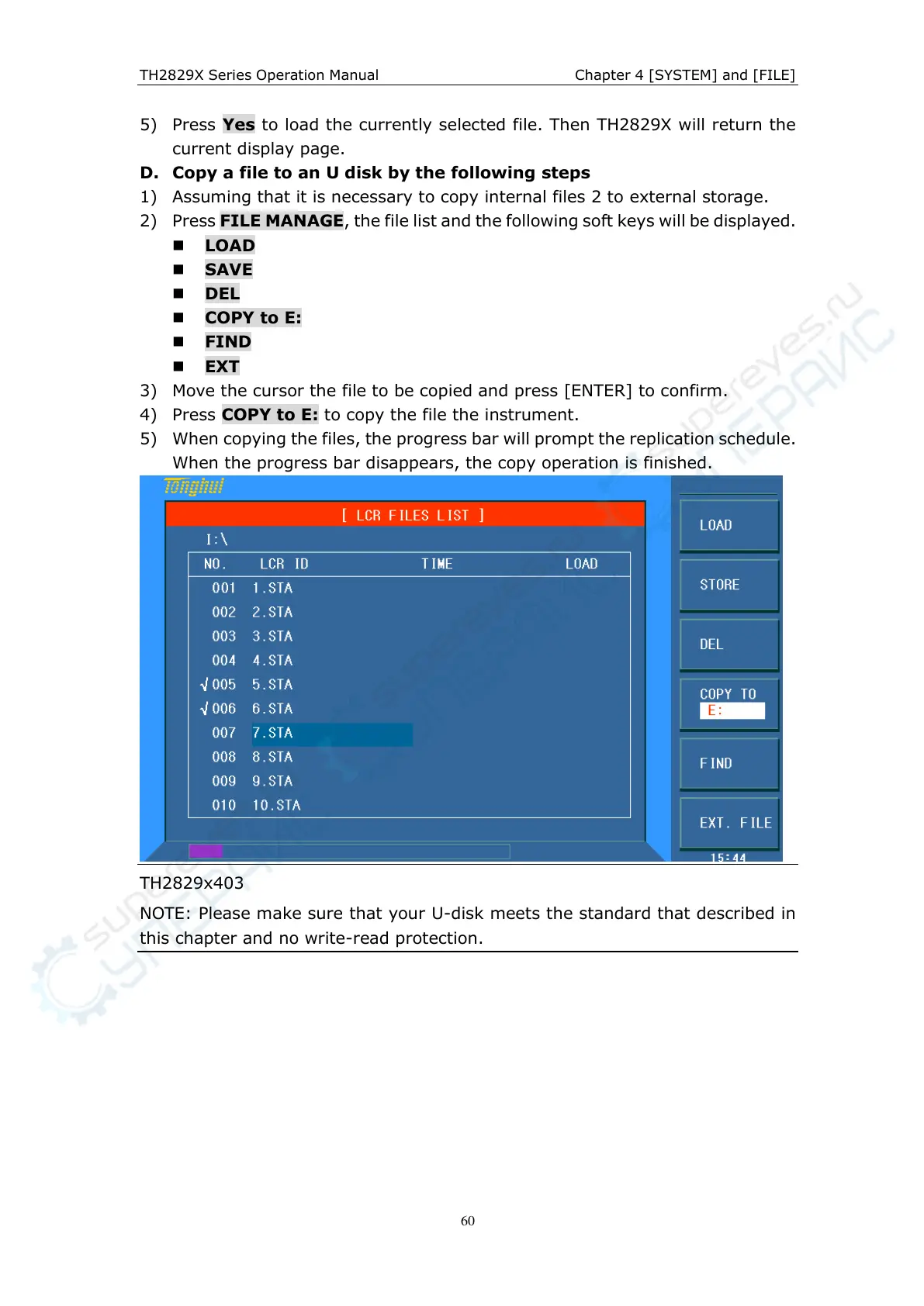 4) Press COPY to E: to copy the file the instrument.