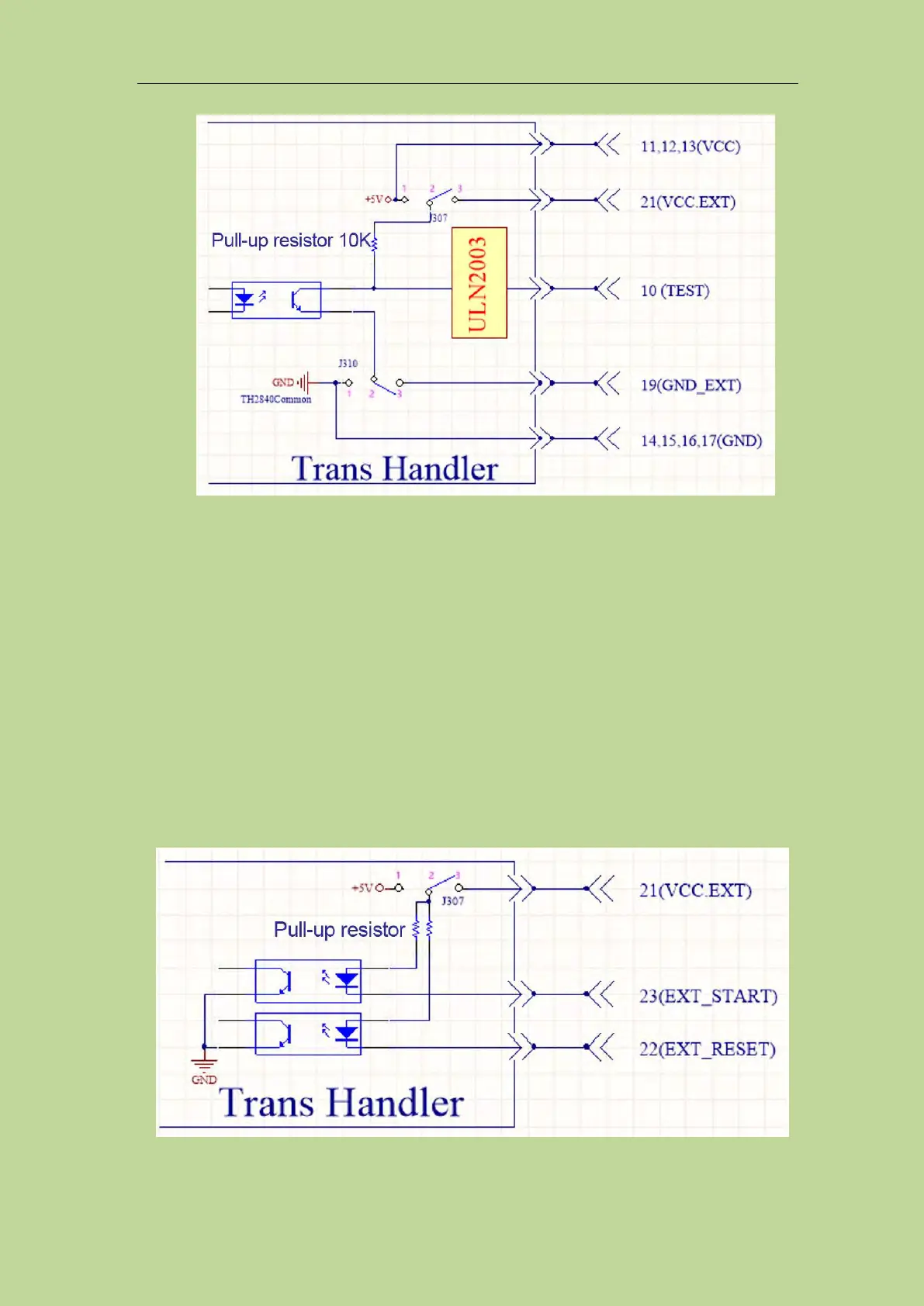 The EXT_START signal (pin 23 of the Trans Handler) is input to the LED cathode side of the