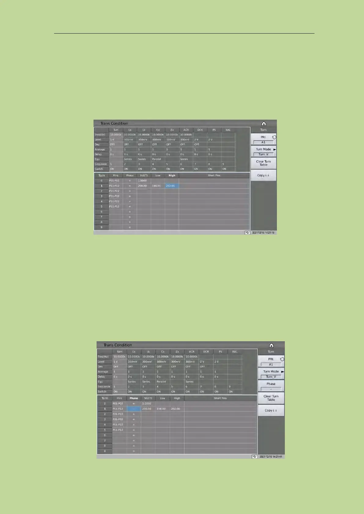 The turns ratio limit setting table is used to set the nominal value, upper and lower limits, phase and