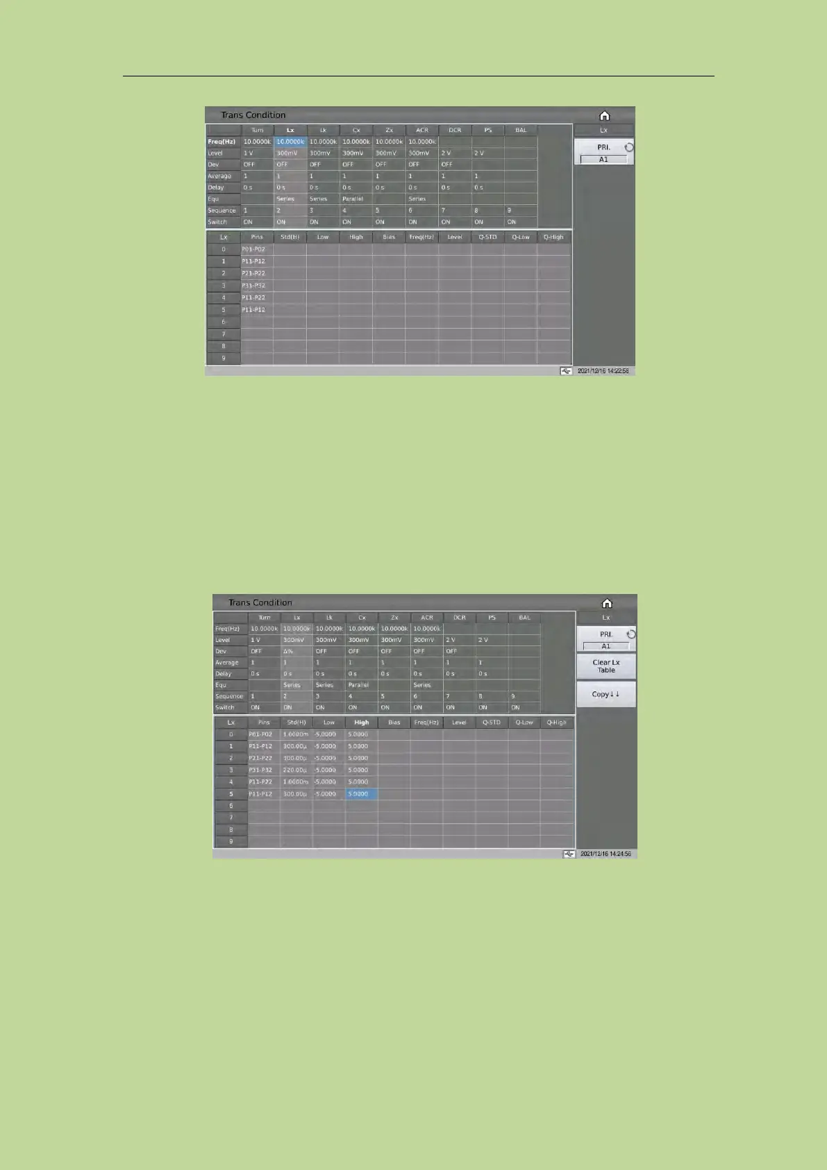 The Lx limit setting table is used to set the Lx standard value, upper and lower limits, bias,
