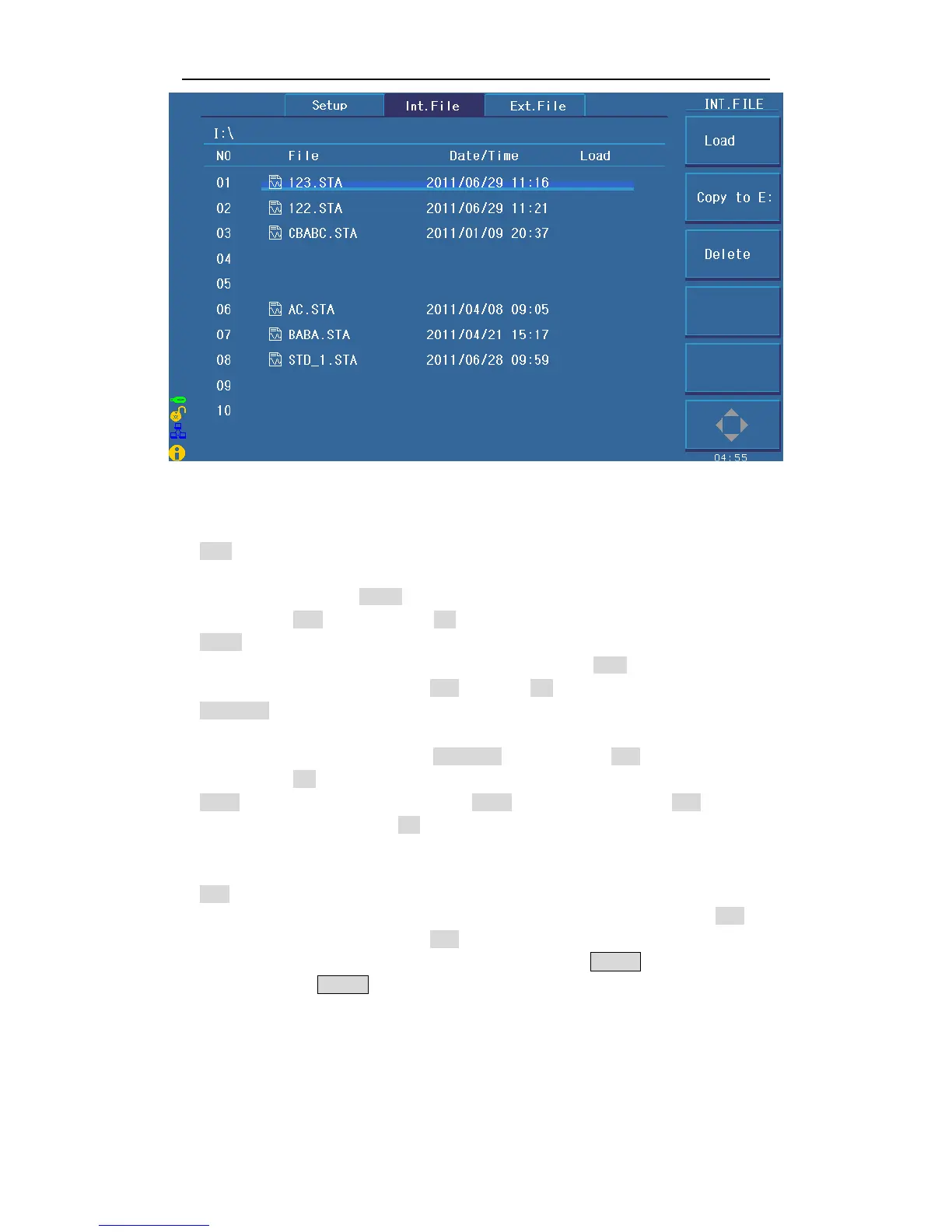 Int. File consists of file number (NO), file name (File), Date/ Time, Load. Following soft keys