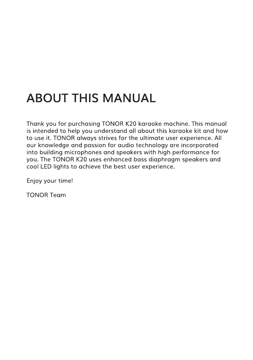 Thank you for purchasing TONOR K20 karaoke machine. This manual