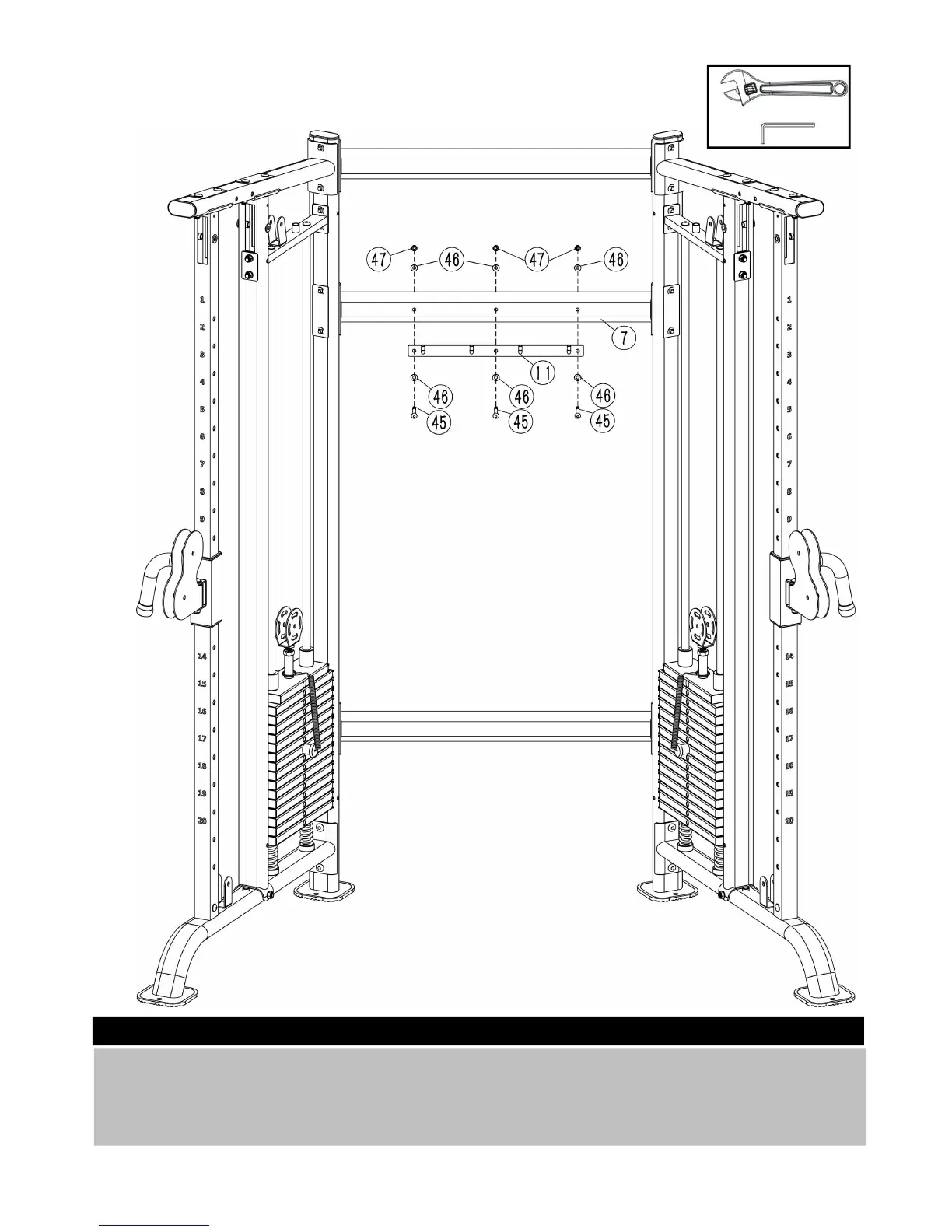 Attach the Hook Frame (11) to the Upper Connecting Frame (7) using 3 x M8×60mm Allen Bolts (45), 6 x
