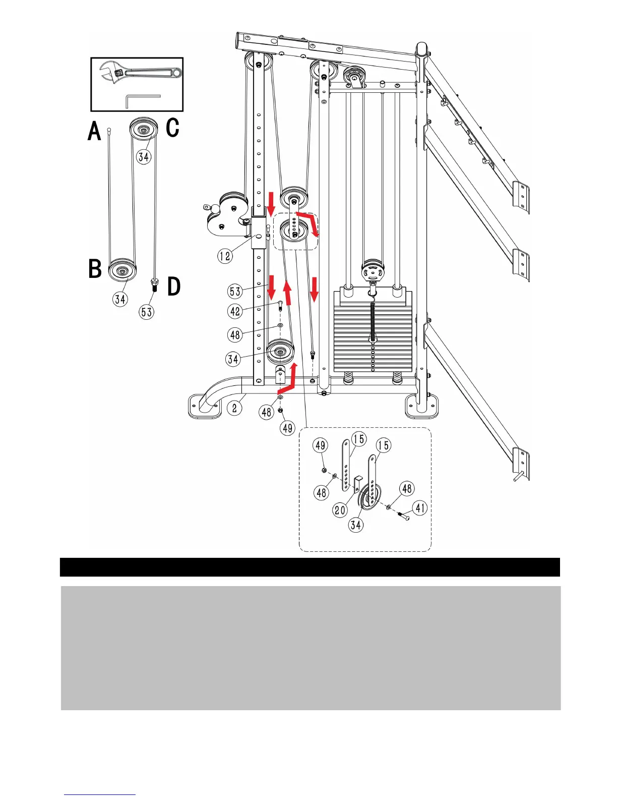 2. Connect the Pulley φ114 B (34) and Adjustment Cable (53) to the Base Frame (2) using 1 x
