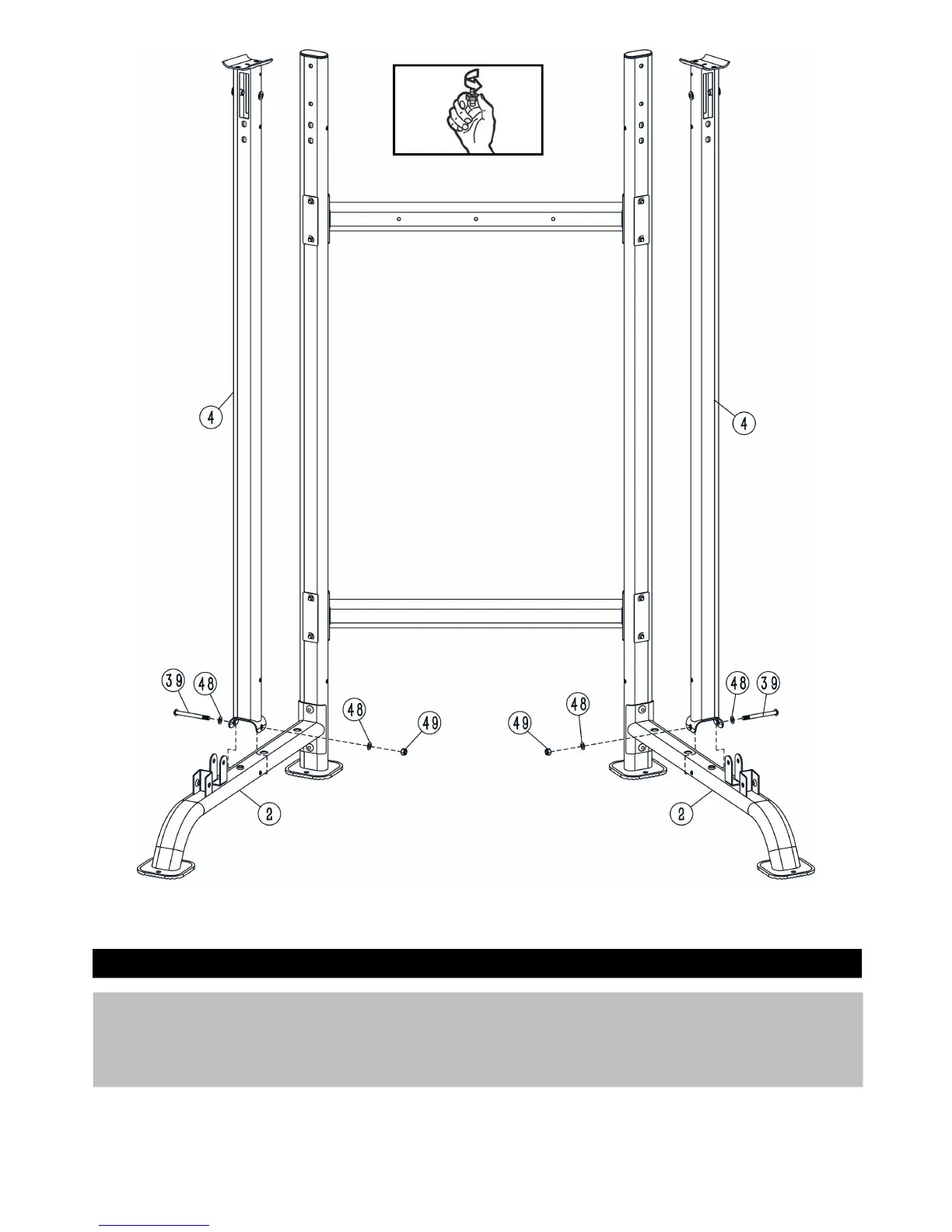 1. Attach 2 x Middle Vertical Support (4) to 2 x Base Frame (2) respectively using 2 x M10×100mm Allen